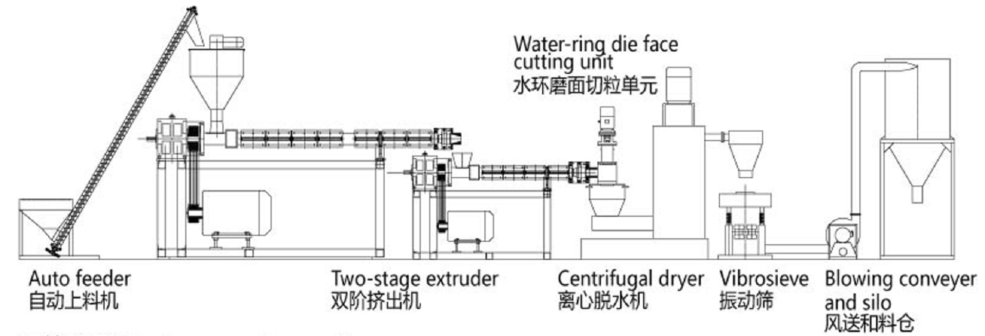 水环模面切粒生产线主要应用于 LDPE,HDPE,PP 等回收片料的造粒。