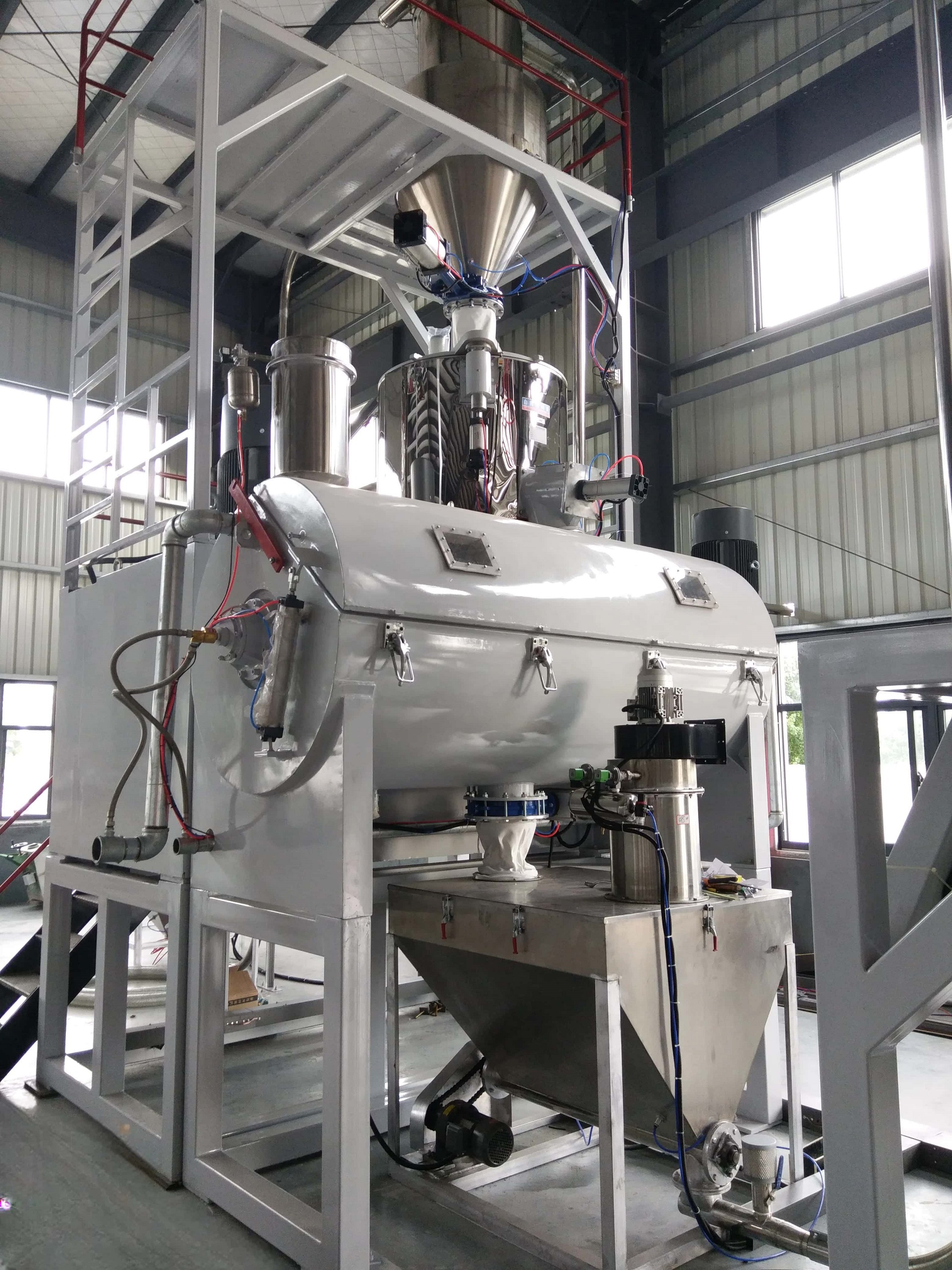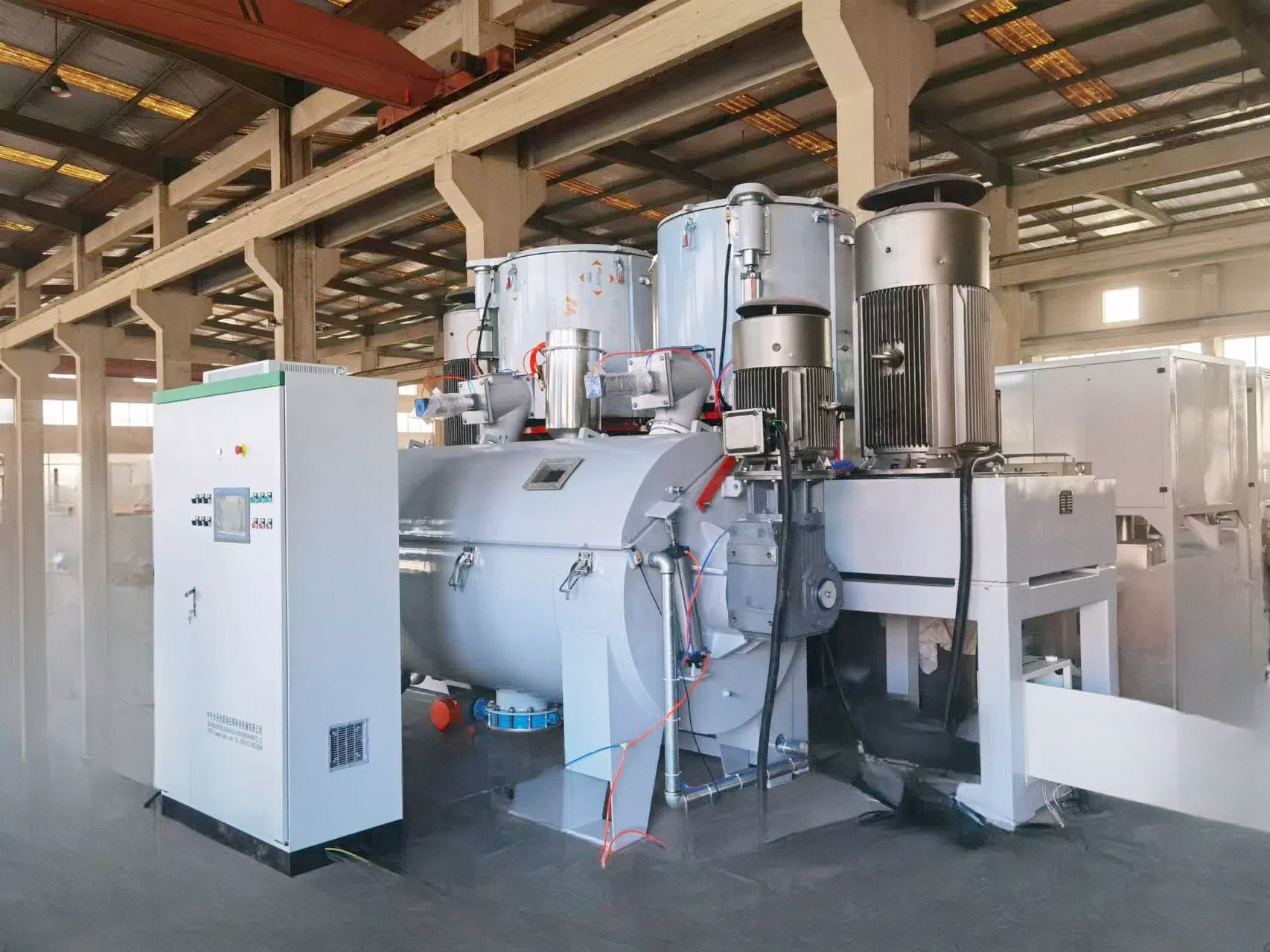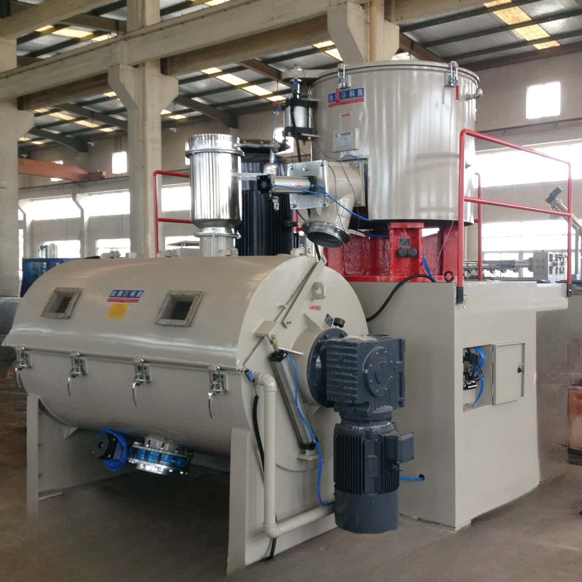 该机组采用热混和卧式冷混相结合的工艺,此工艺对产能大的热混物料排放到卧式冷混中可 实现快速冷却。电器仪表全部采用进口品牌电器,并使用 PLC 电脑编程控制,具有自动化程度高,混合速度快的特性。设备桨叶为精密不锈钢压力铸造,且通过动平衡测试。特别是冷 混机桨叶采用国外先进的螺旋搅拌结构,整个容器内没有死角。设备优点:卧式冷混的冷却 面大,冷却速度快,出料干净,混合效果已达到国外先进水平。
