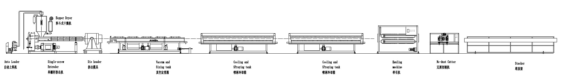 真空定径箱的特殊设计,可以确保直径尺寸的稳定和圆整度,速度控制系统,使牵引速度稳 定。整条生产线采用 PLC 控制,液晶屏幕控制面板,操作简便。可以配备色标挤出机,使 生产的管材有色标线。
