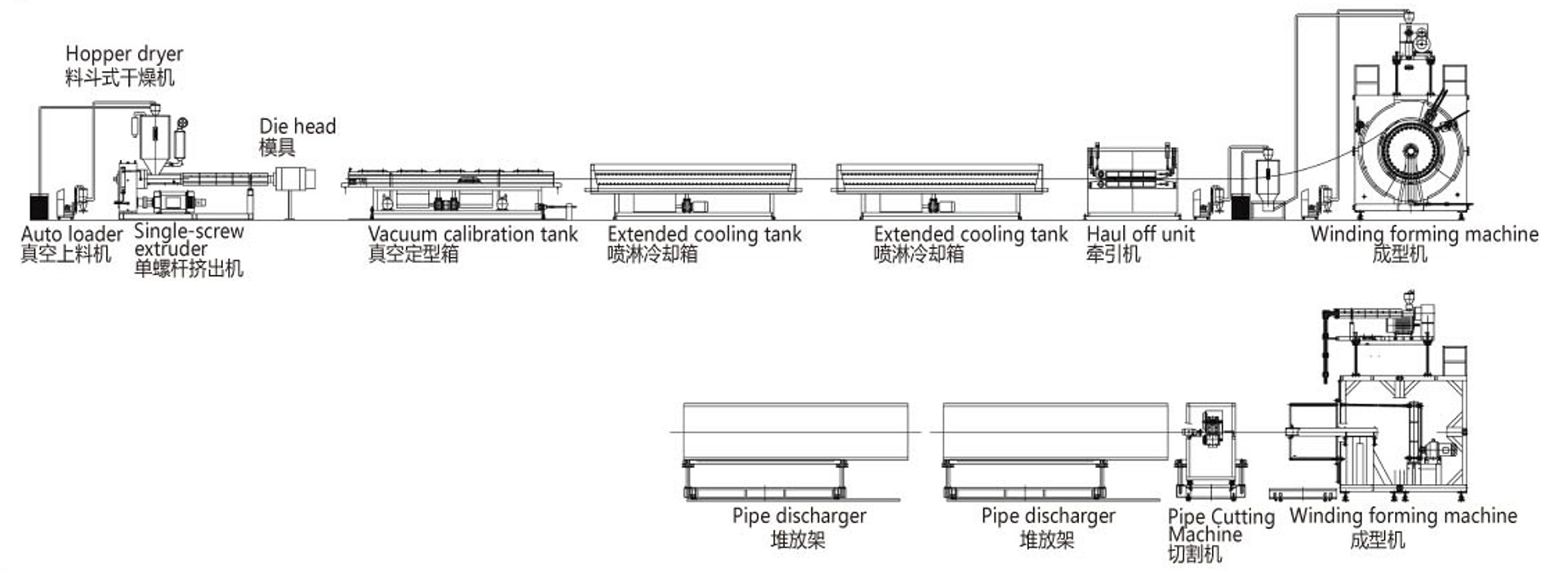 本公司在充分吸收消化欧洲技术的基础上研制成功了中空壁缠绕管生产线,所生产的管材以 高密度聚乙烯PE为主要原料,